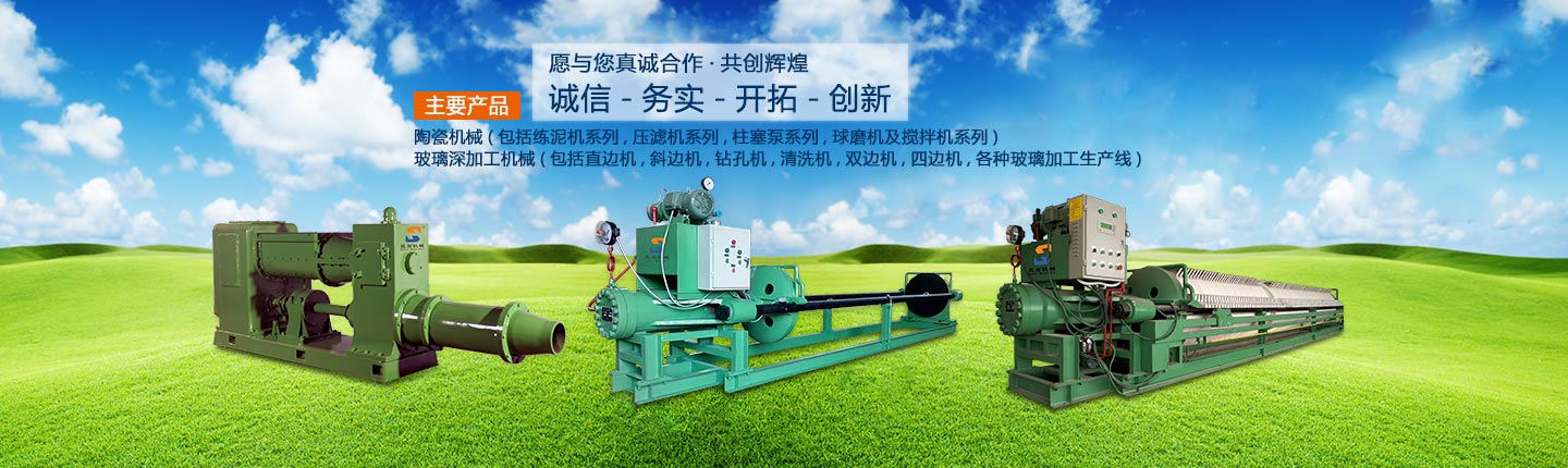 主要產品有:陶瓷機械(包括練泥機系列、壓濾機系列、柱塞泵系列、球磨機及攪拌機系列)玻璃深加工機械(包括直邊機、斜邊機、鉆孔機、清洗機、雙邊機、四邊機,各種玻璃加工生產線)